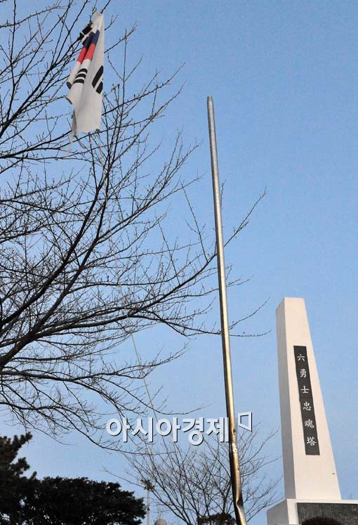 [연평도=아시아경제 윤동주 기자] 26일 오전 인천 연평도 충혼탑 근처의 태극기가 훼손된 체 방치되고 있다.