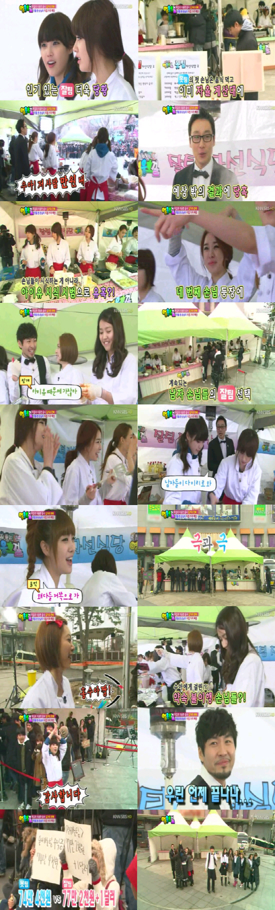 드디어 시작된 길거리 음식 판매. 두 팀은 시민들을 대상으로 100인분의 음식을 판매했다. 처음 몇몇 손님이 '못 팀' 가게를 향하며 '잘 팀'을 당황시켰지만 이내 상황이 역전됐다. 추운 날씨 탓에 따뜻한 음식을 선호한 이유도 있었지만 최근 '대세'로 떠오른 아이유와 유인나의 인기에 '잘 팀'으로 남성팬이 몰린 것.