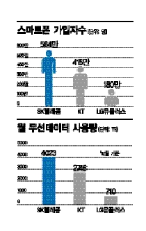 통신 3사에 따르면 무선데이터 사용의 대부분은 스마트폰 사용자로 나타났다. 스마트폰 가입자가 가장 많은 SKT의 경우 전체 무선데이터 사용량의 97%가 스마트폰에서 발생했다. KT는 95%, LG유플러스도 91%로 집계돼 스마트폰으로 촉발된 '스마트 코리아'의 진면목을 보여주고 있다.
