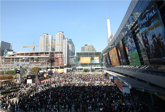 한국콘텐츠진흥원에 따르면 개막일인 10일은 소외계층 나눔 행사로 평소보다 늦은 11시부터 입장이 시작됐다. 이날은 지난해 보다 약 4000명이 적은 4만4000명의 관람객이 '지스타'를 찾았다. 하지만 다음날인 11일 5만2000여명, 12일 9만3000여명, 13일 9만9000여명의 관람객이 몰리며 올해 '지스타'는 역대 최다 관객인 29만여 명을 동원했다. 이는 지난해 28만3000명을 뛰어넘는 수치다. 나흘간 행사장이 '인산인해'를 이뤘다는 얘기다.