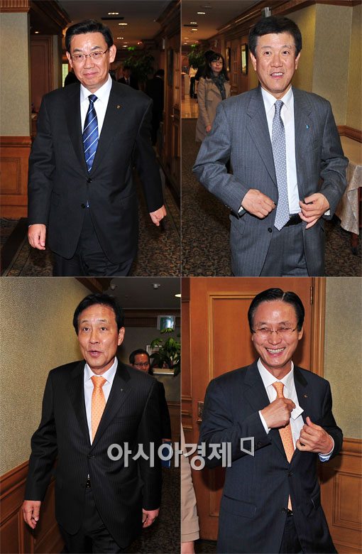 [아시아경제 윤동주 기자] 현 신동규 은행연합회장의 임기 종료를 앞두고 후임 인사에 대한 금융권에 관심이 모아지고 있는 가운데 14일 서울 중구 은행회관에서 열린 전국은행연합 이사회에 김태영 농협중앙회 신용대표이사(윗줄 왼쪽 시계방향), 조준희 기업은행장, 민병덕 국민은행장, 김정태 하나은행장이 참석하고 있다.