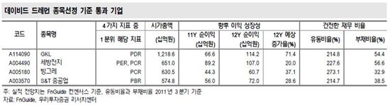 그렇다면 우리 시장에서 주목할 만한 '데이비드 프레먼' 종목은 어떤 것들이 있을까. 우리투자증권은 현재 기준 데이비드 프레먼 종목으로 GKL, 세방전지, 빙그레, S&T중공업을 추천했다.
