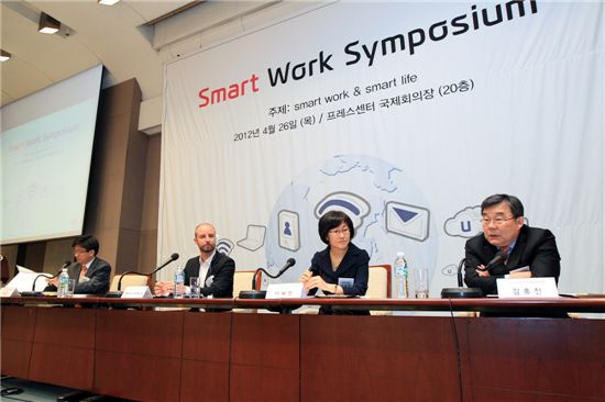 [아시아경제 심나영 기자]KT는 26일 국내외 전문가들과 함께 'Smart work & Smart life'라는 주제로 서울 프레스센터에서 스마트워크 심포지엄을 개최하고 지난 1년 동안의 스마트워크 운영 성과를 발표했으며 이러한 노하우를 기반으로 기업 대상 맞춤형 스마트워크 서비스를 확대할 계획이라고 밝혔다.
