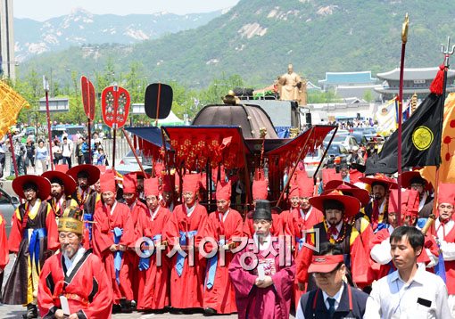 [아시아경제 윤동주 기자] 6일 서울 광화문일대에 종묘제례봉행을 위한 어가행렬이 지나가고 있다. 종묘제례는 조선왕조 역대 왕과 왕비의 신위를 모신 종묘에서 국태민안과 왕조의 번영을 기원하던 의식으로 지난 2001년 유네스코에 의해 제례악과 함께 인류구전 및 무형문화유산으로 지정됐다.