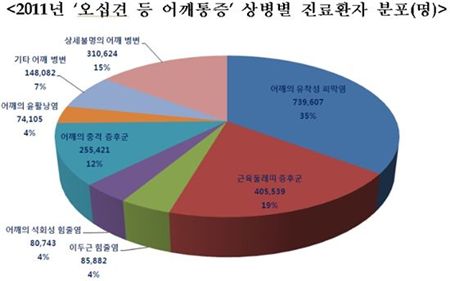 어깨통증 종류별로 구분하면 전체 환자 210만명 중 35%는 '어깨의 유착성 피막염(오십견 포함)'이었고, 19%는 '근육둘레띠 증후군', 15%는 '상세불명의 어깨병변'으로 진단됐다.