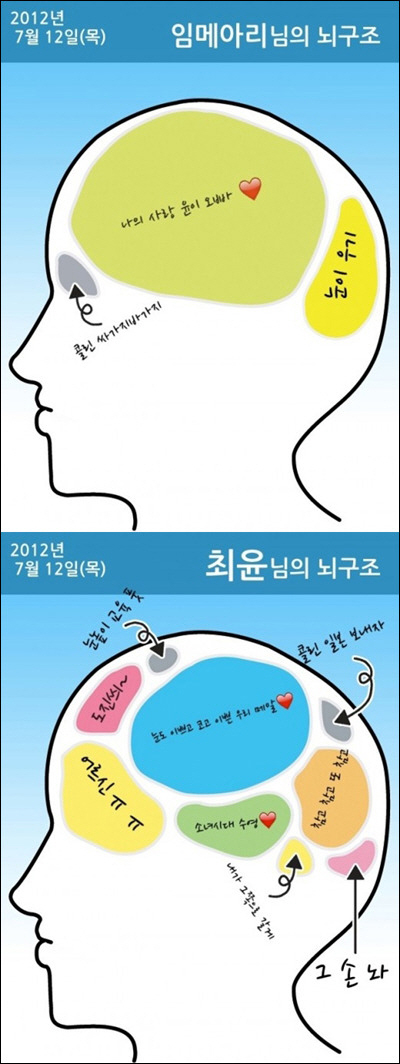이어 최윤의 뇌구조도 공개됐다.그런데 ‘눈도 이쁘고 코도 이쁜 우리 메알’이 가장 큰 부분을 차지해 임메아리를 향한 마음이 큰 것을 보여주며 앞으로 이 커플이 행복한 결말에 대한 추측을 낳게 한다. 또한 ‘소녀시대 수영’ ‘어르신’ ‘참고 참고 또 참고’ ‘콜린 일본 보내자’ 등이 담겨있어 웃음을 자아내고 있다.