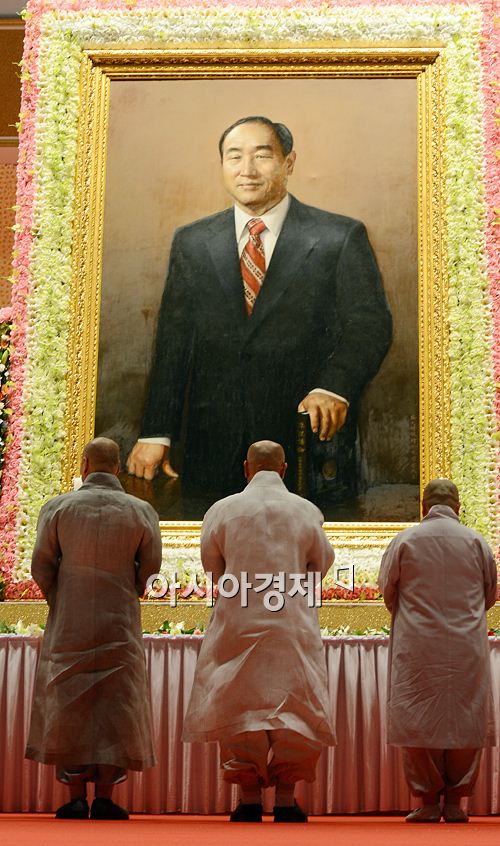 [가평=아시아경제 정재훈 기자] 문선명 통일교 총재 성화식 4일째를 맞은 6일 신도와 일반인 참배가 시작된 가운데 분향소가 마련된 경기 가평군 설악면 송산리 청심평화월드센터에서 불교계 관계자들이 헌화하고 있다.