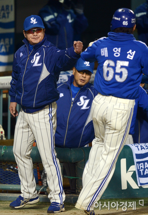 [아시아경제 정재훈 기자] 삼성 류중일 감독이 1일 오후 잠실야구장에서 열린 '2012 팔도 프로야구 한국시리즈' SK 와이번스와 삼성 라이온즈의 6차전 경기 1사 1,3루 상황 최형우의 희생플라이 때 홈인한 배영섭을 반기고 있다.