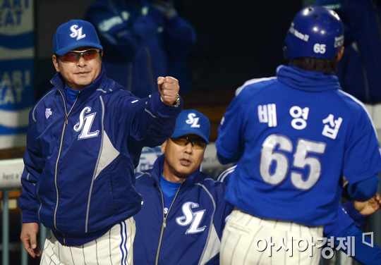 [아시아경제 정재훈 기자] 삼성 류중일 감독이 1일 오후 잠실야구장에서 열린 '2012 팔도 프로야구 한국시리즈' SK 와이번스와 삼성 라이온즈의 6차전 경기 1회초 1사 1,3루 최형우의 희생플라이에 홈을 밟은 배영섭을 반기고 있다.