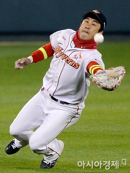 [아시아경제 정재훈 기자] SK 김강민이 1일 오후 잠실야구장에서 열린 '2012 팔도 프로야구 한국시리즈' SK 와이번스와 삼성 라이온즈의 6차전 경기 4회초 선두타자 최형우의 타구를 몸을 던져 잡아내고 있다.