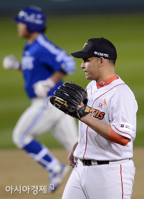 [아시아경제 정재훈 기자] SK 마리오가 1일 오후 잠실야구장에서 열린 '2012 팔도 프로야구 한국시리즈' SK 와이번스와 삼성 라이온즈의 6차전 경기 4회초 1사 1루 상황에서 박석민에게 투런 홈런을 허용하고 있다.