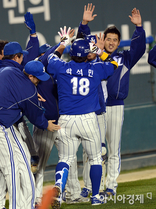 [아시아경제 정재훈 기자] 삼성 박석민이 1일 오후 잠실야구장에서 열린 '2012 팔도 프로야구 한국시리즈' SK 와이번스와 삼성 라이온즈의 6차전 경기 4회초 1사 1루 상황에서 투런 홈런을 친 뒤 동료들의 환영을 받고 있다.