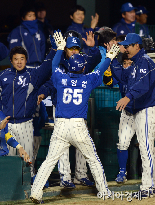 [아시아경제 정재훈 기자] 1일 오후 잠실야구장에서 열린 '2012 팔도 프로야구 한국시리즈' SK 와이번스와 삼성 라이온즈의 6차전 경기 4회초 2사 만루 상황에서 이승엽의 싹쓸이 3루타에 홈을 밟은 배영섭이 동료들의 환영을 받고 있다.