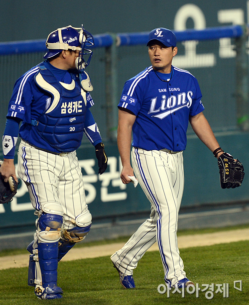 [아시아경제 정재훈 기자] 삼성 오승환이 1일 오후 잠실야구장에서 열린 '2012 팔도 프로야구 한국시리즈' SK 와이번스와 삼성 라이온즈의 6차전 경기 9회말 등판하며 진갑용과 대화를 나누고 있다.