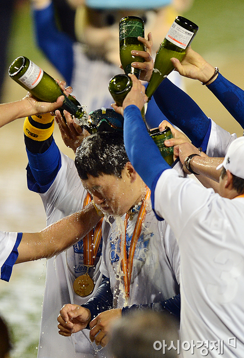 [아시아경제 정재훈 기자] 삼성 라이온즈가 1일 오후 잠실야구장에서 열린 '2012 팔도 프로야구 한국시리즈' SK 와이번스와의 6차전 경기에서 7:0 승리를 거두며 한국시리즈 우승을 차지했다. 한국시리즈 MVP로 선정된 이승엽이 동료들의 축하 샴페인 세례를 받고 있다.