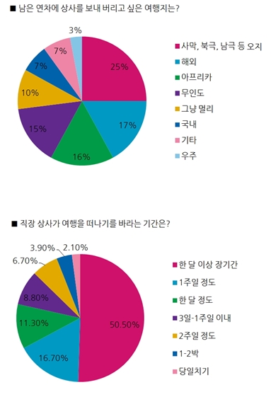 이같은 직장 상사를 보내고 싶은 여행지로는 '사막, 북극, 남극 등 먼 오지'라는 응답이 25%로 가장 많았다. 이어 해외(17%), 아프리카(16%), 무인도(15%) 등이 있었다. 하지만 구체적인 장소를 정하지 않고 '어디든 멀리'라는 응답도 10%나 나왔다. 심지어 우주로 보내겠다는 답변은 3%로 집계됐으며 안드로메다, 버뮤다 삼각지, 달나라 등과 같은 이색 답변도 등장했다.