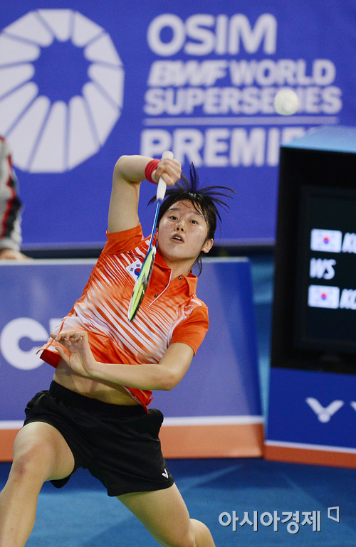[아시아경제 정재훈 기자] 9일 오후 서울 송파구 SK올림픽핸드볼경기장에서 열린 2013 빅터 코리아오픈 배드민턴 대회에서 이민지(청송여고)가 스매싱을 하고 있다.