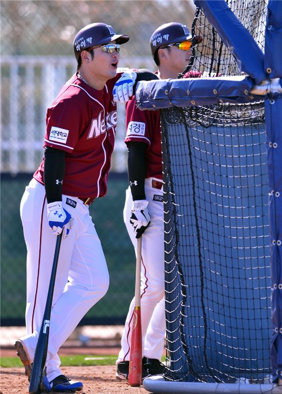 [아시아경제] 넥센 히어로즈가 지난달 20일부터 미국 애리조나에서 스프링캠프를 진행하는 가운데 박병호와 이택근이 동료의 타격을 지켜보고 있다. [사진=넥센 히어로즈 제공]
