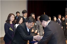 아주복지재단 염재열 부장이 15일 진익철 서초구청장으로부터 표창장을 수여받고 있다.