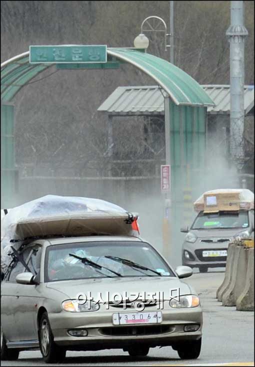 [파주=아시아경제 최우창 기자]북한이 개성공단 잠정중단을 발표한 가운데 9일 경기 파주시 도라산 남북출입국사무소(CIQ)에서 짐을 가득 실려 있는 차량들이 입경 하고 있다.