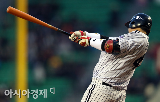 [아시아경제 정재훈 기자] 10일 오후 서울 잠실야구장에서 열린 '2013 한국야쿠르트 세븐프로야구' LG 트윈스와 NC 다이노스의 경기. 2회말 2사 만루 상황에서 조윤준이 2타점 적시타를 치고 있다.