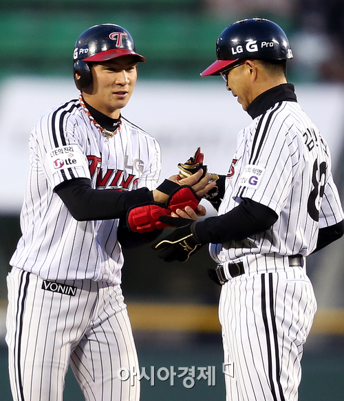 [아시아경제 정재훈 기자] 10일 오후 서울 잠실야구장에서 열린 '2013 한국야쿠르트 세븐프로야구' LG 트윈스와 NC 다이노스의 경기. 2회말 2사 2,3루 상황에서 오지환이 2타점 적시타를 치고 2루까지 진루한 뒤 기뻐하고 있다.