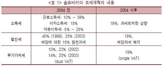 슬로바키아는 기준세율을 낮춰 기업의 투자 환경을 개선하되 단일세율로 복잡한 과세 구조를 대체해 형평성을 높였고, 면세ㆍ비과세 등 특정 제도를 폐지해 이중과세로 인한 문제점을 최소화하는 기본 원칙을 바탕으로 개혁이 이행됐다.