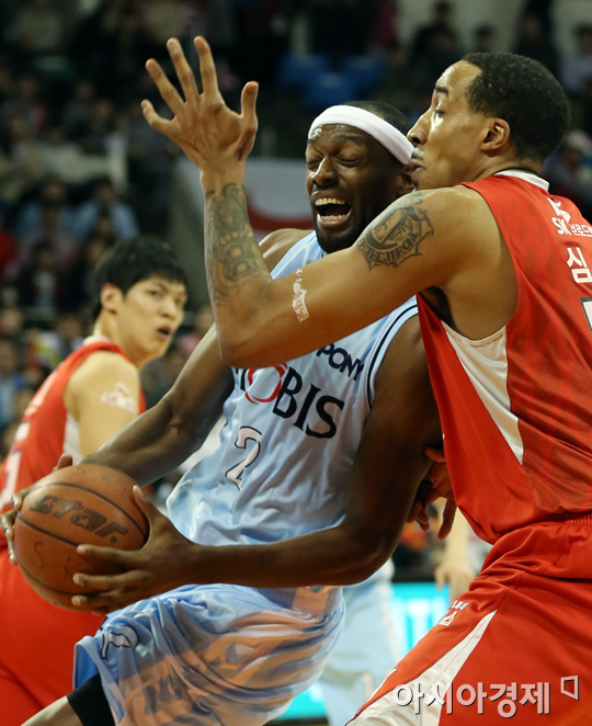 [아시아경제 정재훈 기자] 13일 오후 서울 잠실학생체육관에서 열린 'KB국민카드 2012~2013 프로농구' 서울 SK 나이츠와 울산 모비스 피버스의 챔피언결정전 1차전. 모비스 로드 벤슨이 돌파를 시도하고 있다.