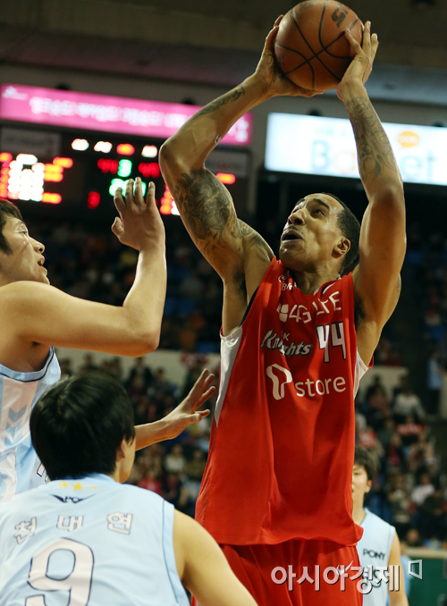 [아시아경제 정재훈 기자] 13일 오후 서울 잠실학생체육관에서 열린 'KB국민카드 2012~2013 프로농구' 서울 SK 나이츠와 울산 모비스 피버스의 챔피언결정전 1차전. SK 심스가 슛을 시도하고 있다.