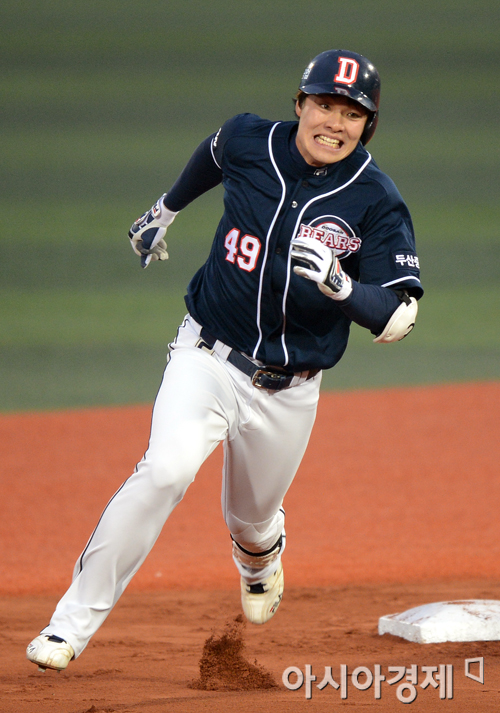 [아시아경제 정재훈 기자] 25일 오후 서울 목동야구장에서 열린 '2013 한국야쿠르트 세븐프로야구' 넥센 히어로즈와 두산 베어스의 경기. 1회초 1사 무주자 상황에서 민병헌이 타격 후 3루 베이스를 향해 달리고 있다.