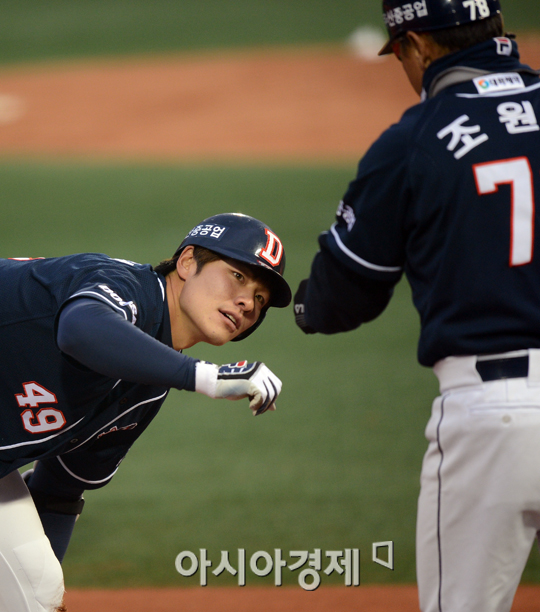 [아시아경제 정재훈 기자] 25일 오후 서울 목동야구장에서 열린 '2013 한국야쿠르트 세븐프로야구' 넥센 히어로즈와 두산 베어스의 경기. 1회초 1사 무주자 상황에서 민병헌이 우중간 3루타를 친 뒤 조원우 코치와 기쁨을 나누고 있다.