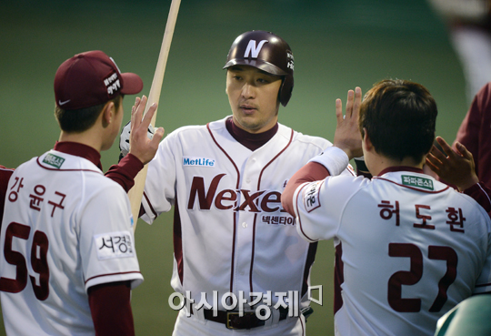 [아시아경제 정재훈 기자] 25일 오후 서울 목동야구장에서 열린 '2013 한국야쿠르트 세븐프로야구' 넥센 히어로즈와 두산 베어스의 경기. 1회말 2사 무주자 상황에서 이택근이 좌익수 뒤 홈런을 쳐낸 뒤 선발투수 강윤구와 기뻐하고 있다.