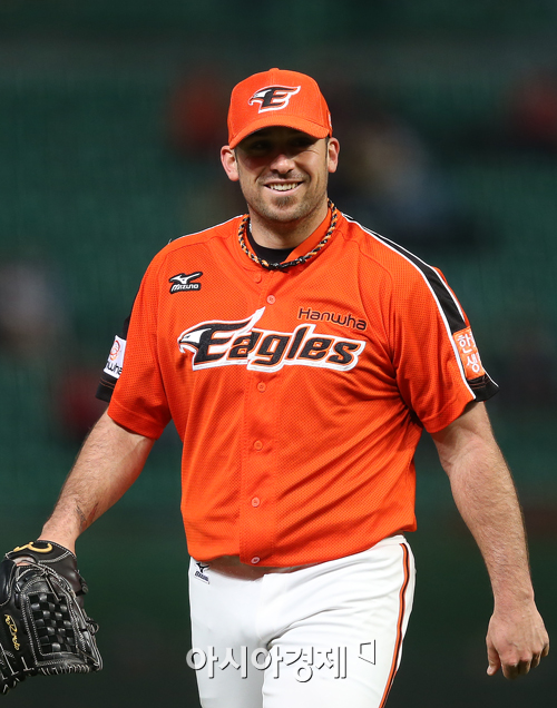 [인천=아시아경제 정재훈 기자] 26일 오후 인천 문학야구장에서 열린 '2013 한국야쿠르트 세븐프로야구' SK 와이번스와 한화 이글스의 경기. 한화 선발투수 이브랜드가 3회말 투구를 마치고 미소를 짓고 있다.