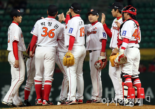 [인천=아시아경제 정재훈 기자] 26일 오후 인천 문학야구장에서 열린 '2013 한국야쿠르트 세븐프로야구' SK 와이번스와 한화 이글스의 경기. 6:1 승리를 거둔 SK 선수들이 기뻐하고 있다.