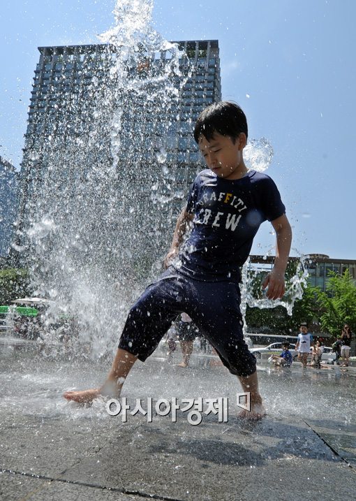 [아시아경제 백소아 기자] 서울 낮 기온이 27도를 기록하며 초여름 날씨를 보인 17일 서울 광화문 광장 분수대에서 어린들이 더위를 식히고 있다.