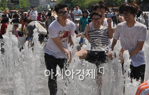 [아시아경제 백소아 기자] 서울 낮 기온이 27도를 기록하며 초여름 날씨를 보인 17일 서울 광화문 광장 분수대에서 학생들이 더위를 식히고 있다.
