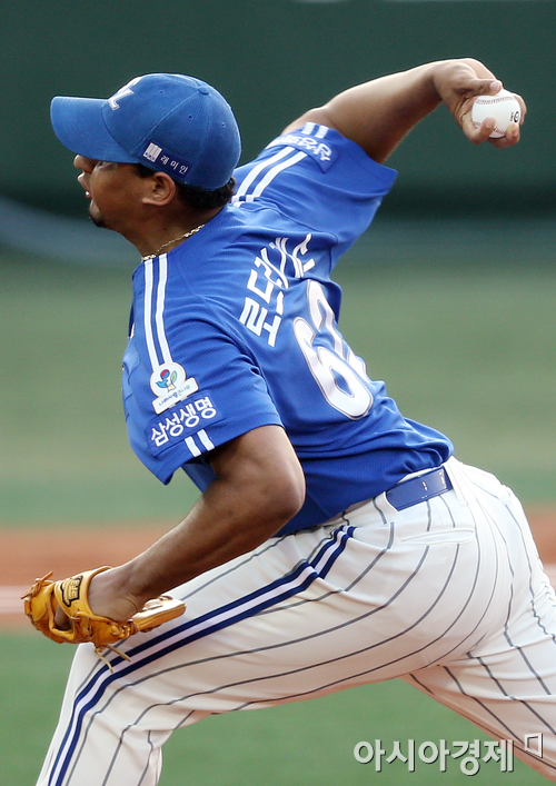 [아시아경제 정재훈 기자] 4일 오후 서울 목동야구장에서 열린 '2013 한국야쿠르트 세븐프로야구' 넥센 히어로즈와 삼성 라이온즈의 경기. 삼성 선발투수 로드리게스가 역투하고 있다.