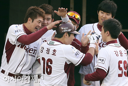 [아시아경제 정재훈 기자] 4일 오후 서울 목동야구장에서 열린 '2013 한국야쿠르트 세븐프로야구' 넥센 히어로즈와 삼성 라이온즈의 경기. 2회말 1사 무주자 상황 강정호가 좌익수 뒤 솔로홈런을 치고 동료들과 기쁨을 나누고 있다.