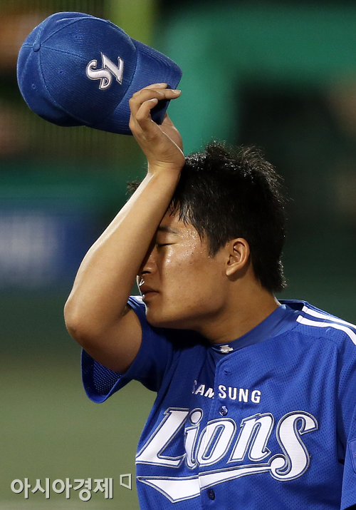 [아시아경제 정재훈 기자] 4일 오후 서울 목동야구장에서 열린 '2013 한국야쿠르트 세븐프로야구' 넥센 히어로즈와 삼성 라이온즈의 경기. 7회말 1사 3루 상황 마운드에 오른 심창민이 이택근, 김민성을 연속 삼진으로 잡아낸 뒤 땀을 닦고 있다.