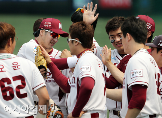 [아시아경제 정재훈 기자] 6일 오후 서울 목동야구장에서 열린 '2013 한국야쿠르트 세븐프로야구' 넥센 히어로즈와 삼성 라이온즈의 경기. 2회초 2사 무주자 상황 유한준이 김태완의 타구를 몸을 던져 잡아낸 뒤 동료들과 기쁨을 나누고 있다.
