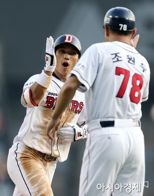 [아시아경제 정재훈 기자] 6일 오후 서울 잠실야구장에서 열린 '2013 한국야쿠르트 세븐 프로야구' 두산 베어스와 삼성 라이온즈의 경기. 3회말 선두타자 이종욱이 우익수 뒤 홈런을 치고 기뻐하고 있다.