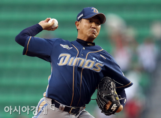 [아시아경제 정재훈 기자] 10일 오후 서울 잠실야구장에서 열린 '2013 한국야쿠르트 세븐 프로야구' LG 트윈스와 NC 다이노스의 경기. NC 선발투수 손민한이 역투하고 있다.