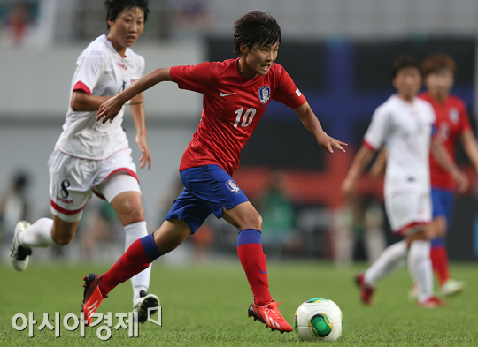 [아시아경제 정재훈 기자] 21일 오후 서울월드컵경기장에서 열린 '2013 EAFF 동아시안컵' 여자부 대한민국과 북한의 경기. 지소연이 돌파를 시도하고 있다.