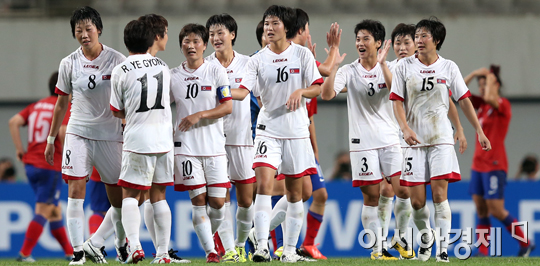 [아시아경제 정재훈 기자] 21일 오후 서울월드컵경기장에서 열린 '2013 EAFF 동아시안컵' 여자부 대한민국과 북한의 경기. 2:1 승리를 거둔 북한 선수들이 기뻐하고 있다.
