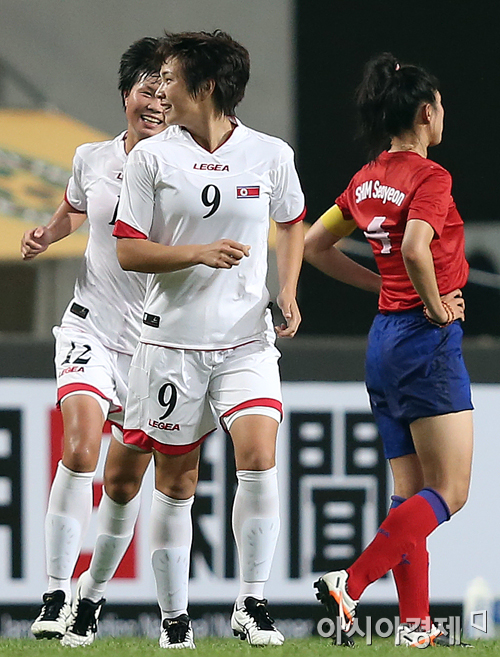 [아시아경제 정재훈 기자] 21일 오후 서울월드컵경기장에서 열린 '2013 EAFF 동아시안컵' 여자부 대한민국과 북한의 경기. 2:1 승리를 거둔 북한 선수들이 기뻐하고 있다.