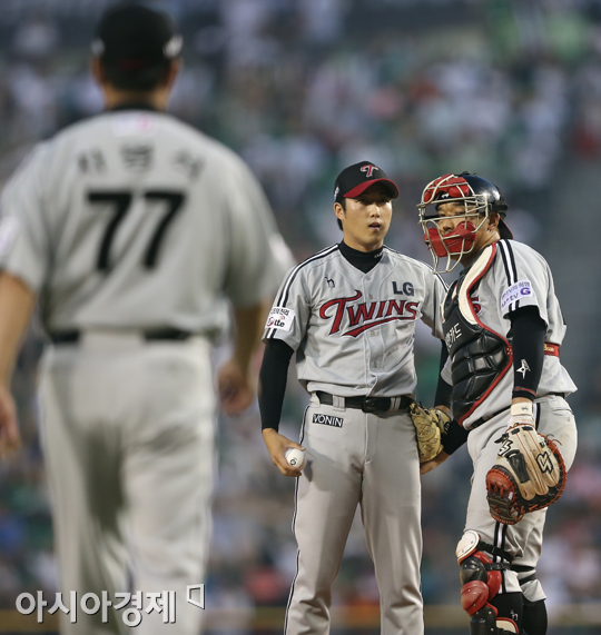 [아시아경제 정재훈 기자] 26일 오후 서울 잠실야구장에서 열린 '2013 한국야쿠르트 세븐 프로야구' LG 트윈스와 두산 베어스의 경기. 3회말 차명석 코치가 마운드의 신정락을 향해 다가가고 있다.