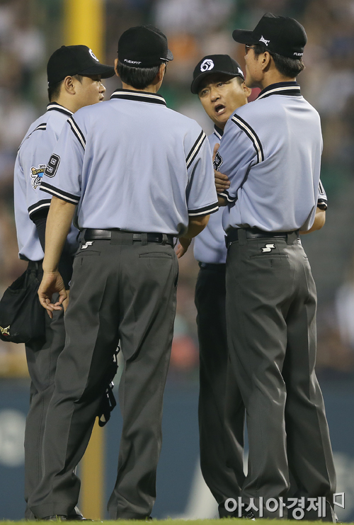 [아시아경제 정재훈 기자] 26일 오후 서울 잠실야구장에서 열린 '2013 한국야쿠르트 세븐 프로야구' LG 트윈스와 두산 베어스의 경기. 4회초 1사 1루 상황 정성훈의 타구에 우익수 플라이 아웃 판정이 내려진 상황에서 김기태 감독의 항의를 받은 심판들이 논의를 벌이고 있다. 항의가 받아들여져 안타로 판정 번복.
