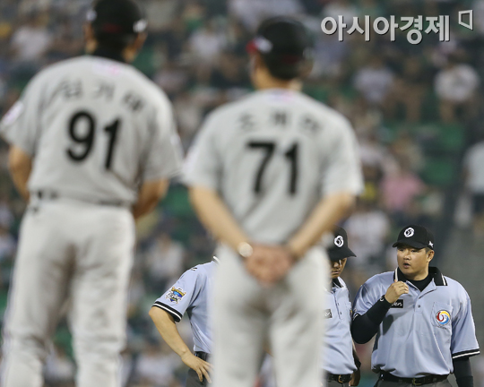[아시아경제 정재훈 기자] 26일 오후 서울 잠실야구장에서 열린 '2013 한국야쿠르트 세븐 프로야구' LG 트윈스와 두산 베어스의 경기. 4회초 1사 1루 상황 정성훈의 타구에 우익수 플라이 아웃 판정이 내려진 상황에서 김기태 감독의 항의를 받은 심판들이 논의를 벌이고 있다. 항의가 받아들여져 안타로 판정 번복.
