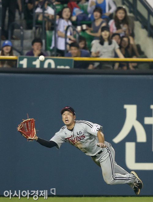 [아시아경제 정재훈 기자] 26일 오후 서울 잠실야구장에서 열린 '2013 한국야쿠르트 세븐 프로야구' LG 트윈스와 두산 베어스의 경기. 이병규가 5회말 1사 2루 상황 오재원의 타구를 몸을 날려 잡아내고 있다.