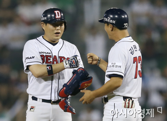 [아시아경제 정재훈 기자] 26일 오후 서울 잠실야구장에서 열린 '2013 한국야쿠르트 세븐 프로야구' LG 트윈스와 두산 베어스의 경기. 6회말 무사 1, 3루 상황 양의지가 1타점 적시타를 치고 기뻐하고 있다.